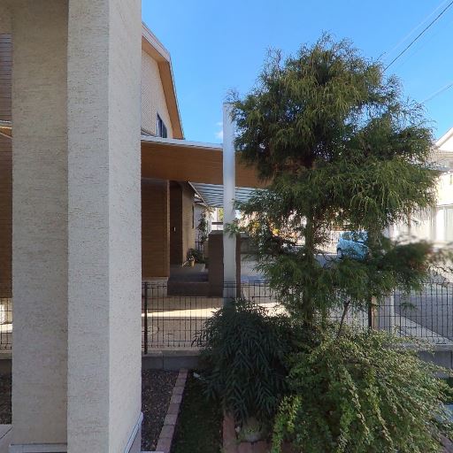外観と周辺住宅の築浅感(確度74%):外壁や門柱が比較的きれいで、周辺も統一感のある新しめの住宅が並ぶ印象。