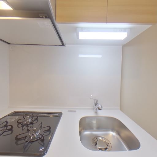 キッチン設備(2口コンロ・レンジフード)(確度86%):ガス2口コンロ、シンク、レンジフード、上下収納が確認できる。