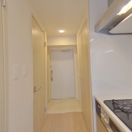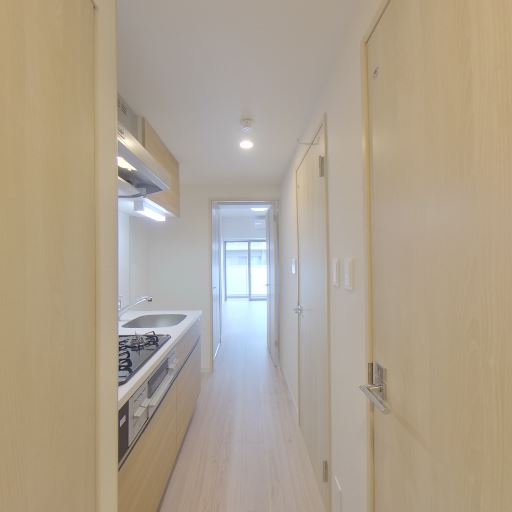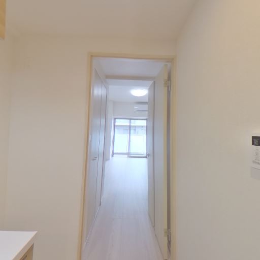 玄関から室内へ一直線の動線(確度86%):キッチンの横に玄関が見え、廊下は狭めだがまっすぐ居室へ続く。