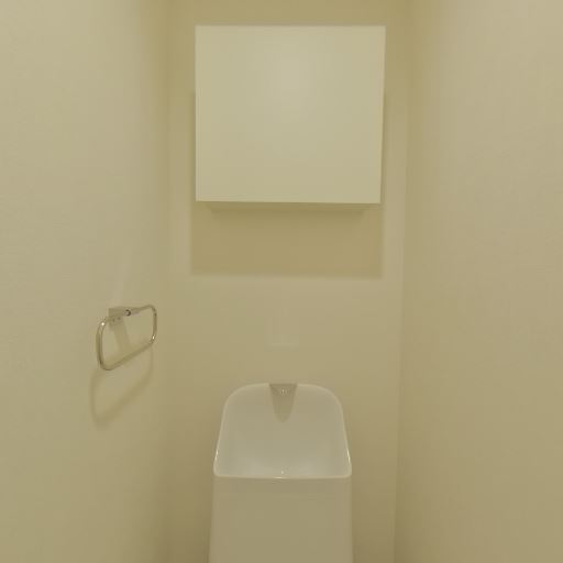 トイレの設備と収納(確度86%):タンクレストイレに見え、便器上部に吊戸棚収納がある。ペーパーホルダーも設置済み。