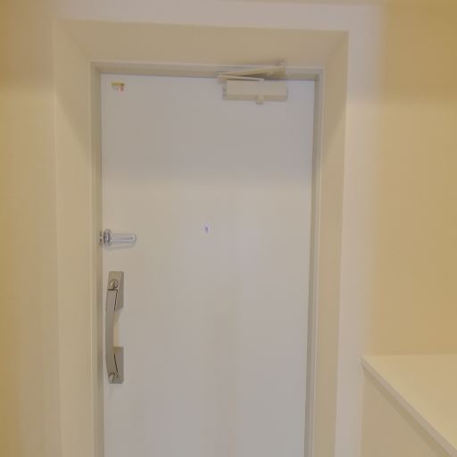 玄関ドアと内側ドアクローザー(確度78%):防音・防犯性の高そうなスチールドアで、ドアクローザーが設置されている。ポスト覗き穴もあり一般的な設備。
