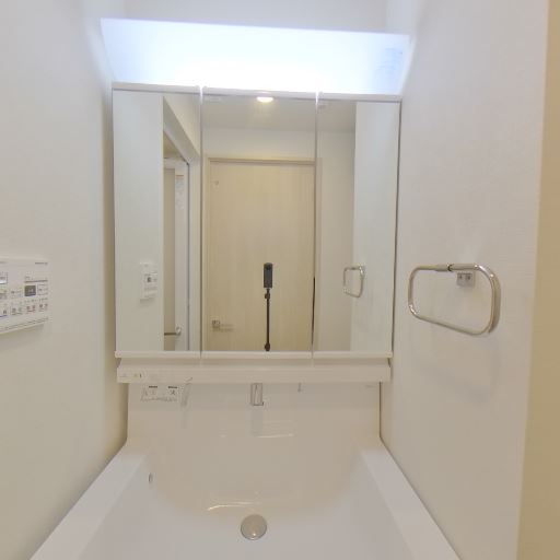 独立洗面台と収納付きミラー(確度86%):三面鏡タイプの独立洗面台で、鏡裏に収納があると見られる。照明も一体型。