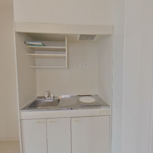 ミニキッチン(IH1口・収納少なめ)(確度86%):コンパクトなキッチンでIHコンロ1口と小さめのシンク、吊り棚が見える。作業スペースは限られる。