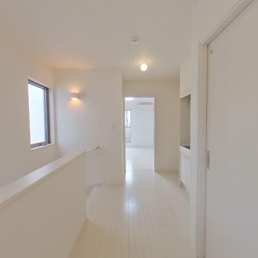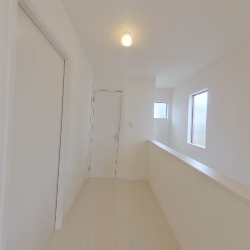 明るい廊下と手すり付き吹き抜け風(確度80%):廊下に窓が複数あり、白基調で明るい。腰壁と手すりがあり、下階が見える構造。