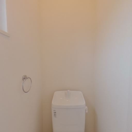 タオルリングとペーパーホルダーあり(確度83%):壁にタオルリングと、便座横のペーパーホルダーが確認できる。
