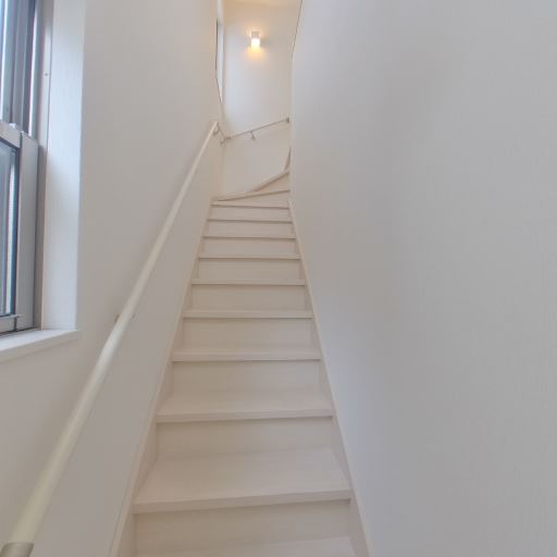 階段に窓があり明るい(確度81%):階段横にすりガラス窓があり、自然光が入る。