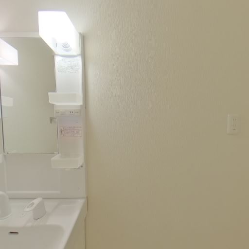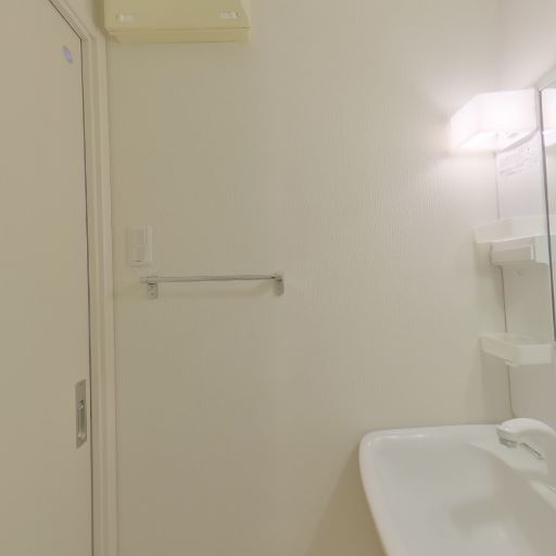 タオルバーと収納スペース(確度72%):洗面台横にタオルバー、天井近くに吊戸棚かボックスがある。