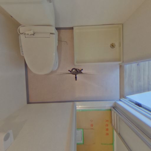 室内洗濯機置き場あり(確度90%):防水パンと給水栓・排水口が設置されている。