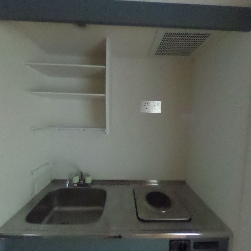ミニキッチン(単身向け仕様)(確度88%):一口コンロと小型シンク、上部にオープン棚がある簡易キッチン。調理スペースはかなり限られる。