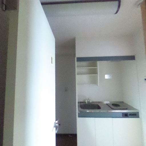 玄関周りにミニキッチンあり(確度84%):ドア付近に1口IHコンロとシンクのあるコンパクトなキッチンが見える。棚も最小限に設置。