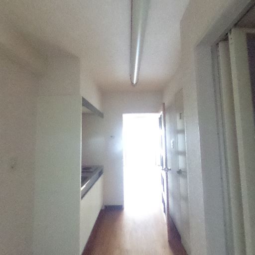 共用廊下側の玄関まで一直線のレイアウト(確度66%):キッチンから玄関まで細長い廊下が続く一般的な1Kの動線。