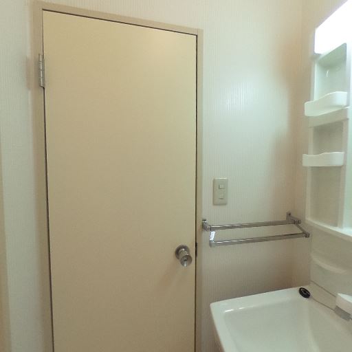タオル掛けなどの付帯設備(確度78%):ドア横にタオルバー、洗面台周りに小物棚がある。