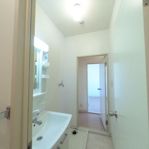 独立洗面台とランドリースペース(確度86%):洗面化粧台とその横に洗濯機置き場が確認できる。廊下側に扉があり、洗面脱衣室として使える構成。