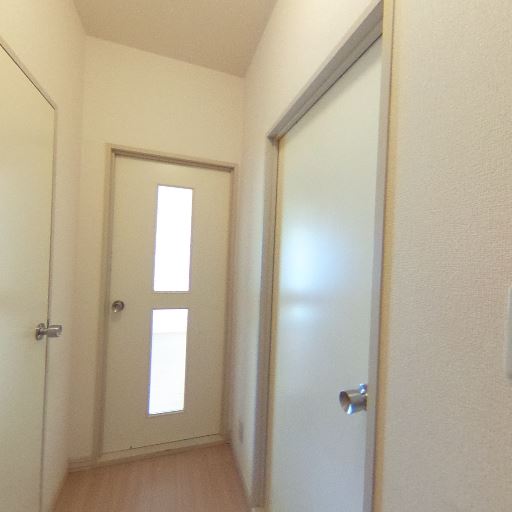 ドアが複数ある廊下動線(確度80%):玄関から細い廊下が伸び、左右と正面に室内ドアがある。