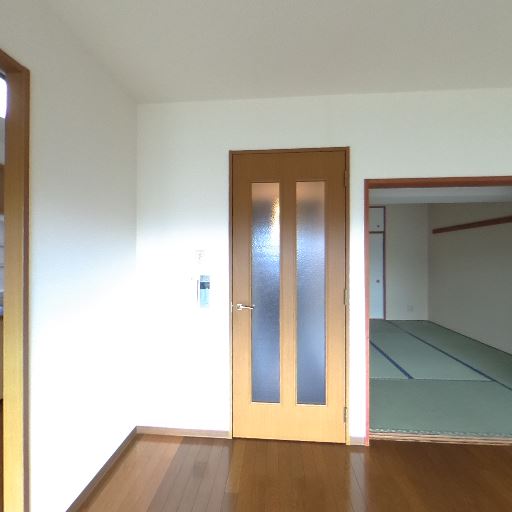 LDKと和室がつながる間取り(確度90%):洋室フローリングのLDKに隣接して和室があり、開口部が広めで連続利用しやすい構成に見える。