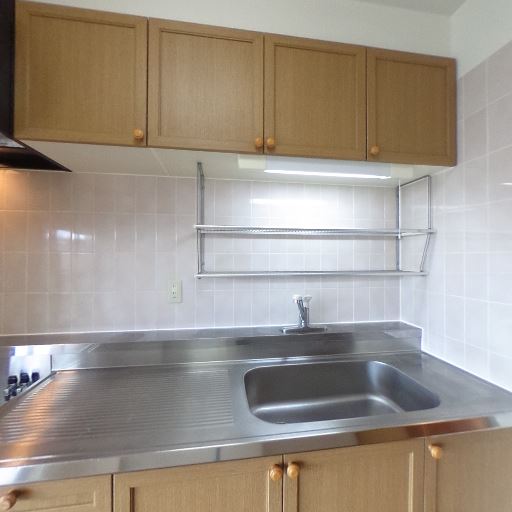 収納量は標準的だが作業スペースはやや小さめに見えるキッチン(確度74%):上下収納はある一方で、シンク横の調理スペースは広くは見えず、複数人調理や作業のしやすさは限定的と考えられる。