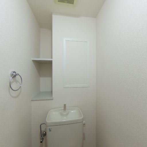 トイレ内に収納棚がある(確度95%):便器上部の壁面にオープン棚が設けられており、トイレットペーパーや掃除用品の置き場として使えそう。