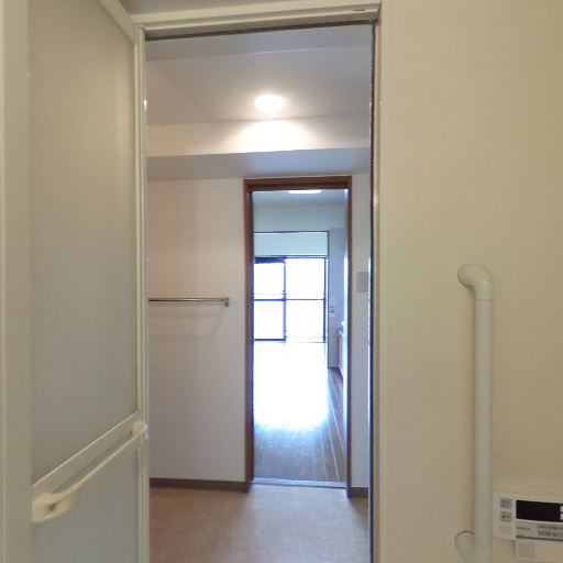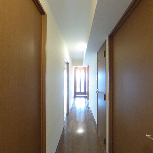 廊下の先から自然光が入っている(確度84%):室内奥の開口部または窓から強い自然光が差し込んでおり、玄関側まで明るさが届いている。