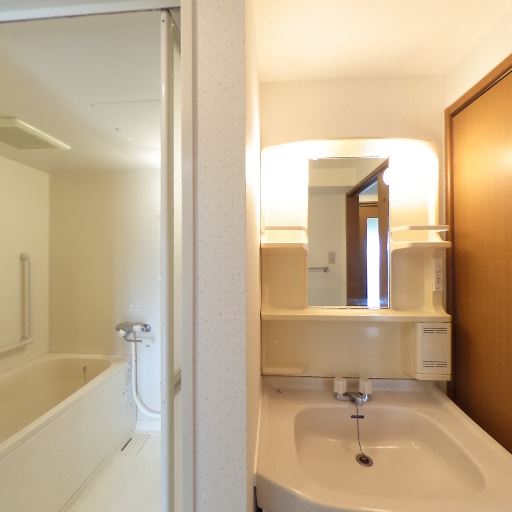 浴室が別で確保されている(確度90%):洗面スペースの隣に浴槽付きの浴室が見えており、3点ユニットではない可能性が高い。