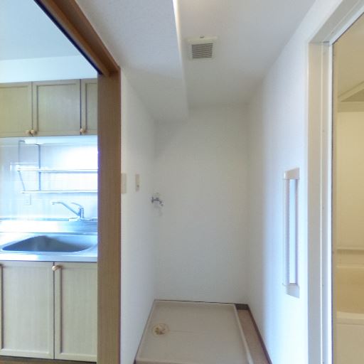 洗濯機置き場が室内にある(確度96%):廊下状の洗面脱衣スペース奥に防水パンと給水栓があり、室内洗濯機置き場と判断できる。