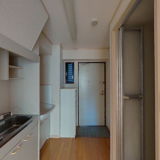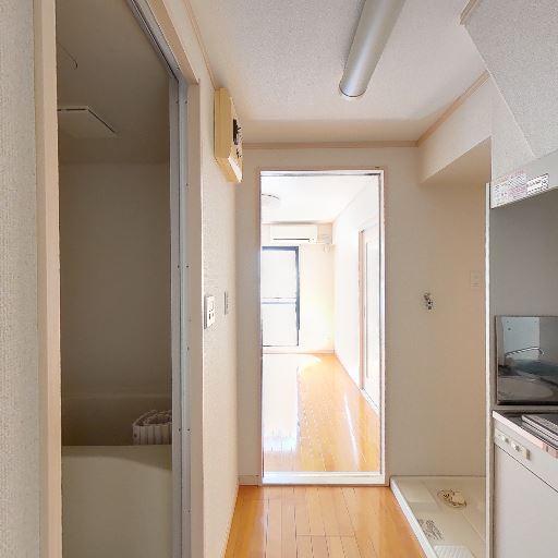 浴室からキッチンへの近接(確度70%):浴室の扉を出るとすぐにキッチンが見える配置。ワンルーム仕様で動線は短いが、湯気や湿気が室内に広がりやすい可能性。