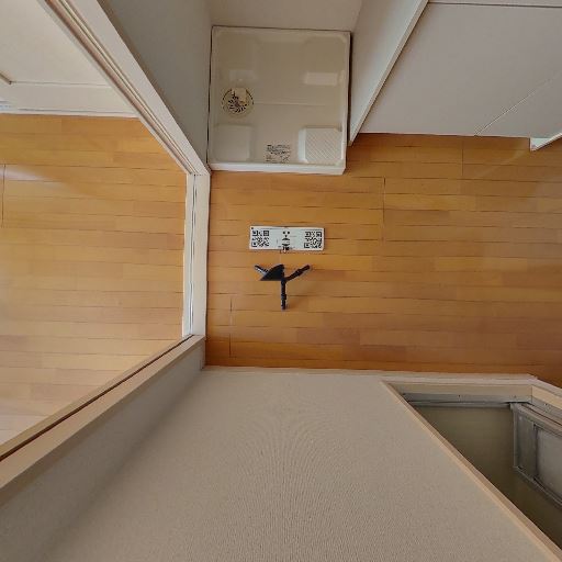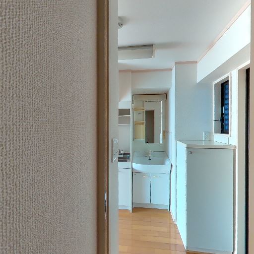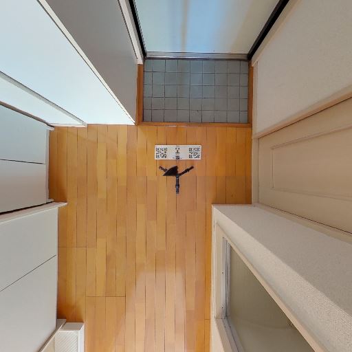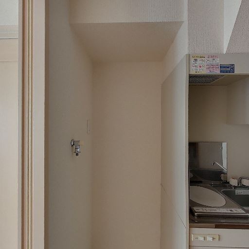 室内洗濯機置き場あり(確度90%):床面に防水パンが設置され、給水栓も壁に見える。