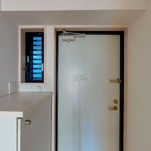玄関に小窓と下駄箱(確度86%):玄関ドア横に縦長の小窓と腰高の下駄箱があり、採光と収納が確保されている。