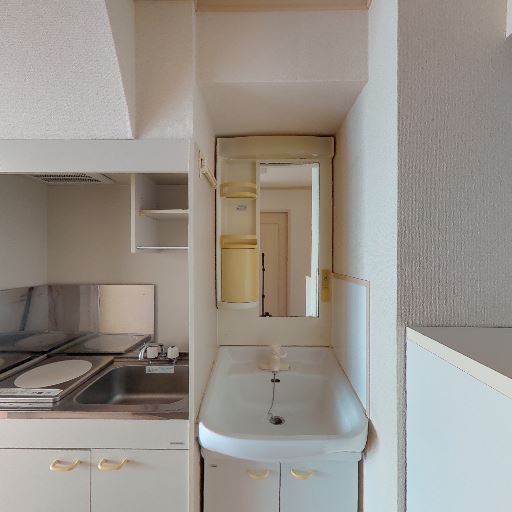 ミニキッチンと洗面のレイアウト(確度80%):1口IHコンロと小型シンクのミニキッチンの隣に独立洗面ボウルが並ぶ配置。