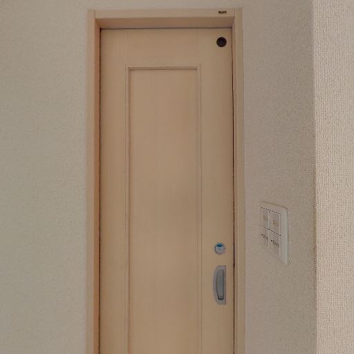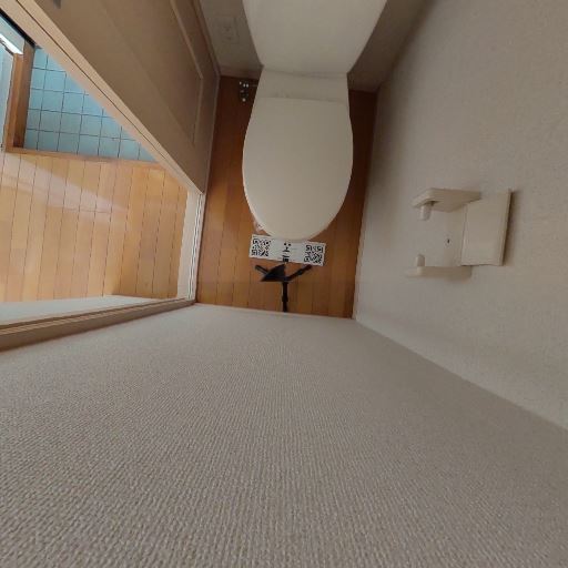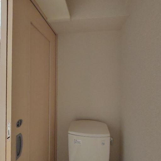 独立トイレの様子(確度88%):個室タイプのトイレで、ドアは引き戸。床はフローリング調、壁は織り目のあるビニールクロス。ペーパーホルダーが壁面にあり、タンクレス風の便器が設置されている。