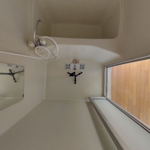ユニットバスの様子(確度82%):浴槽・シャワー・鏡があるコンパクトなユニットバス。壁・天井・浴槽は明るい色で清潔感がある。