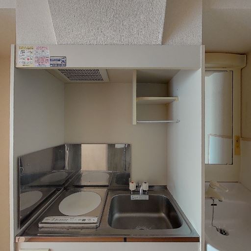 単身向けのコンパクトキッチン(確度80%):シンク小さめ・一口コンロと見られるユニットで調理スペースは限られる。収納は上下にあり最低限は確保。