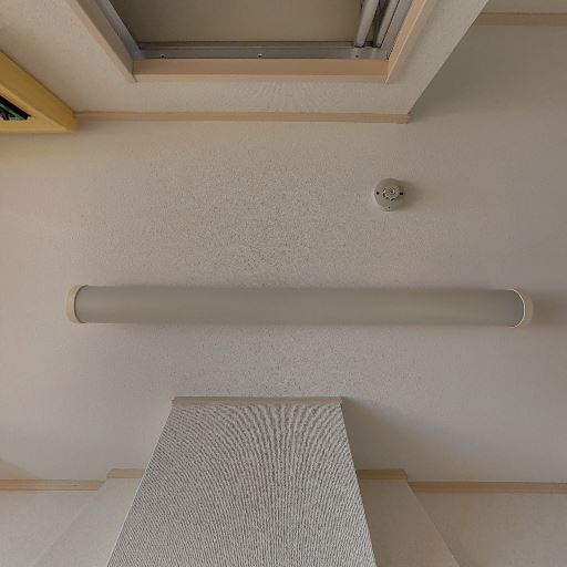 室内照明と点検口(確度77%):天井に細長い蛍光灯タイプの照明、近くに点検口と火災報知器がある。