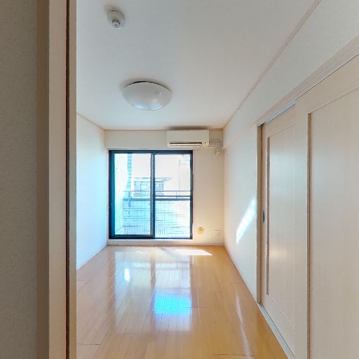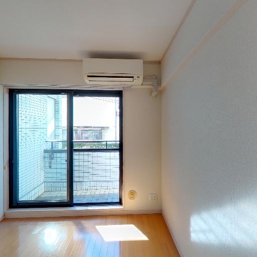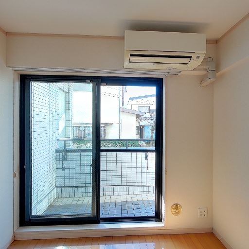 居室の採光良好・バルコニー接面(確度88%):大きめの掃き出し窓とエアコンが見え、床面に日差しが入っている。