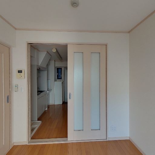居室からキッチン・玄関への直線動線(確度78%):引き戸の向こうに細長い廊下状のキッチンと玄関が一直線に配置されている。