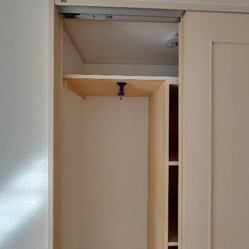 収納スペース(確度86%):引き戸の中に上部棚とハンガーパイプ付きのクローゼットがある。