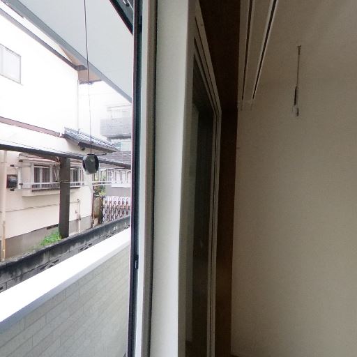 • 採光・眺望(確度78%):掃き出し窓があり外の建物とバルコニーの手すりが見える。採光は確保できるが正面に建物が近い。