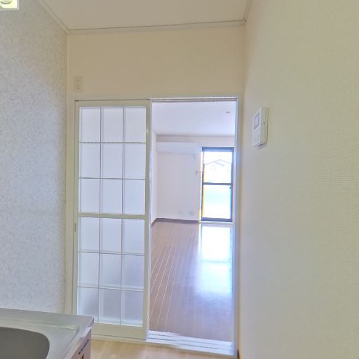 キッチンから居室への導線(確度69%):半透明の引き戸の先に居室があり、直線的に出入りできる。床材の段差も小さそう。