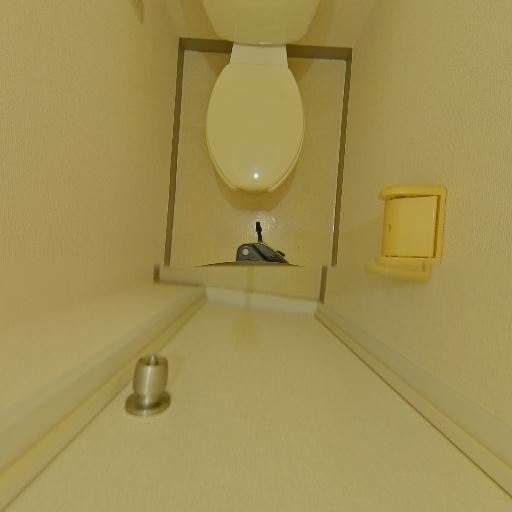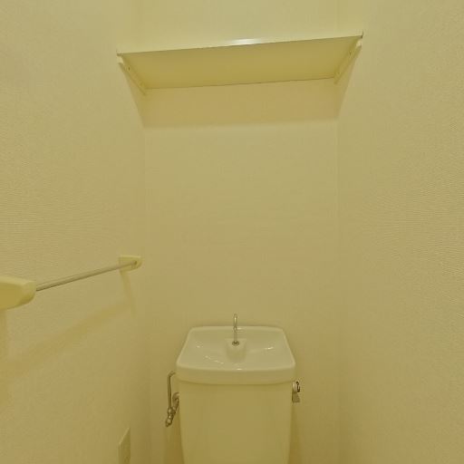 トイレの設備構成(確度90%):タンク付き便器、上部にオープン棚、壁付けペーパーホルダーとタオルバーが確認できる。