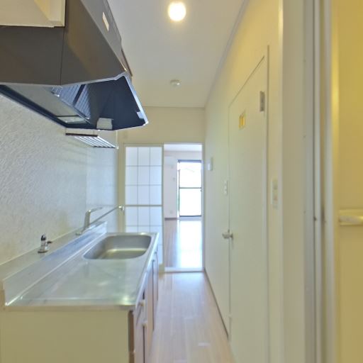 廊下にキッチン配置(確度86%):玄関から続く廊下に1列型キッチンとレンジフードが並ぶ。