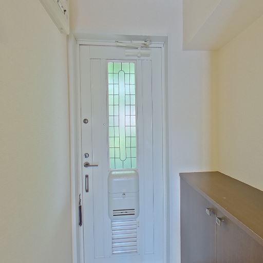 玄関ドアに採光窓(確度78%):玄関ドア中央に縦長のガラスがあり、廊下に自然光が入る。
