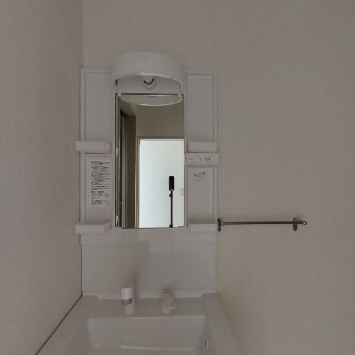 • 独立洗面台あり(確度88%):鏡付きの独立洗面化粧台が設置されている。コンセントや小物置き場も見える。