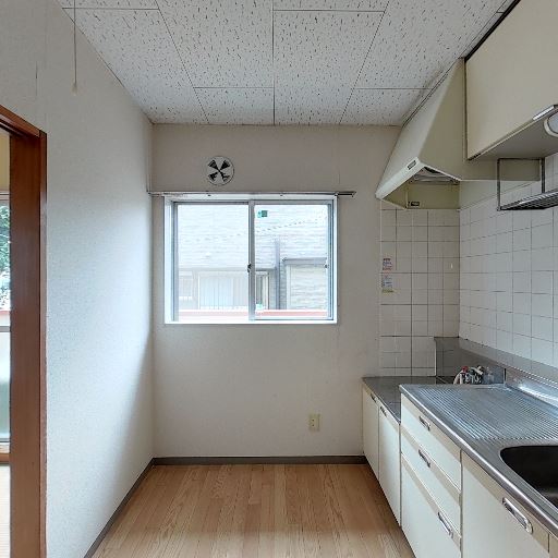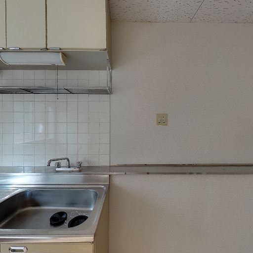 • キッチン設備の状態(確度82%):シンク・2口コンロ一体型のステンレス天板と吊戸棚があり、古めだが清潔感は保たれている。レンジフードやタイルの油はね防止も見える。