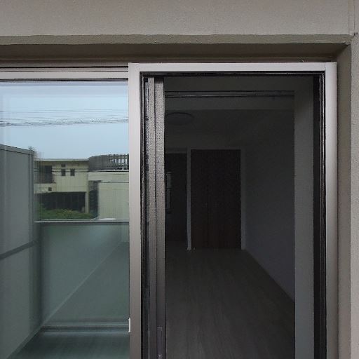 採光とバルコニー(確度86%):全面が掃き出し窓で外にはバルコニーが見える。すりガラス手すりで視線はほどよくカットされる。