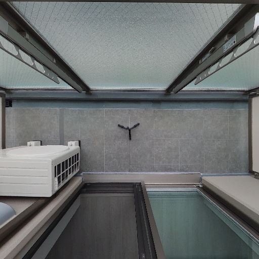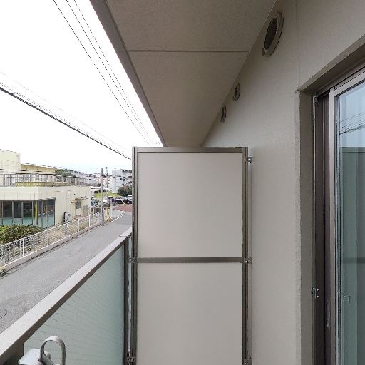 バルコニーの設備(確度86%):物干し金物が天井面に2列あり、洗濯物を干せる。屋根や上面の庇で多少の雨を避けられそう。