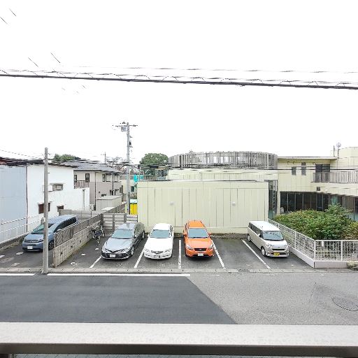 眺望と前面の抜け(確度83%):バルコニー正面は駐車場と低層建物で抜けがあり、圧迫感が少ない。