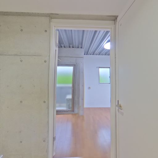 コンクリート打ちっぱなしと白壁でデザイン性が高い(確度92%):壁面にコンクリート打ちっぱなし仕上げが使われ、白壁と木目床を組み合わせた内装になっている。全体としてスタイリッシュで個性的な印象を受ける。