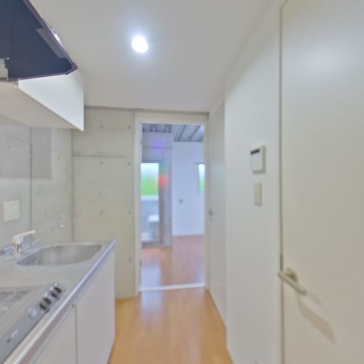 居室側に開口があり明るさが期待できる(確度78%):キッチンから見える先の居室に窓やガラス開口が確認でき、奥の空間から自然光が入る可能性が高い。