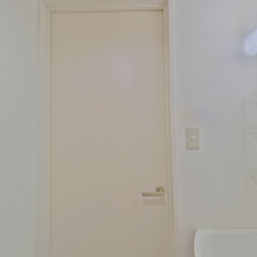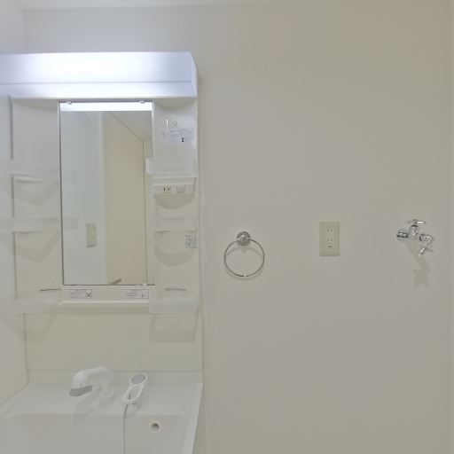 清潔感のある白基調の内装(確度90%):壁・建具・洗面設備が白を基調に統一されており、全体として明るく清潔感のある印象を受ける。