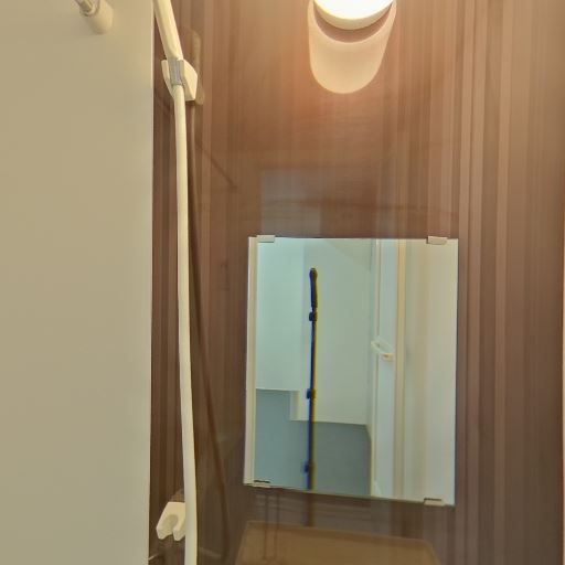 鏡とシャワー設備が整っている(確度95%):壁面に鏡、シャワーヘッド、スライドバーがあり、基本的な浴室設備はひと通り揃っている。