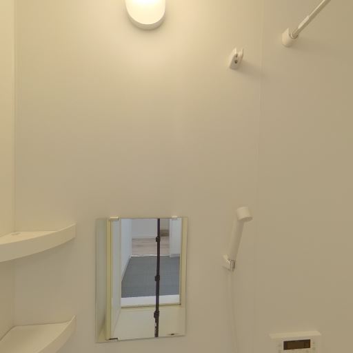 鏡とシャワー付きで基本設備は揃っている(確度95%):壁面に鏡とハンドシャワーが設置されており、日常使用に必要な基本的な浴室設備が確認できる。